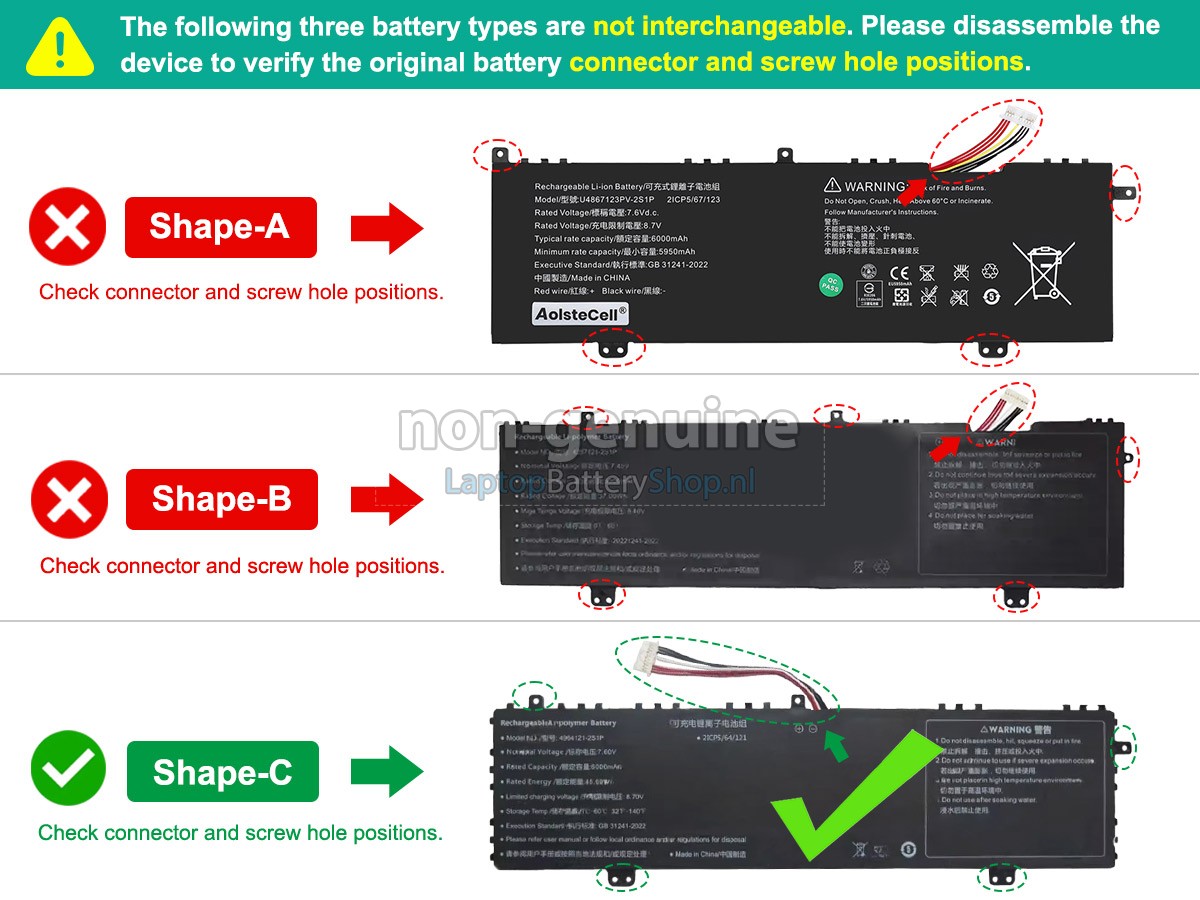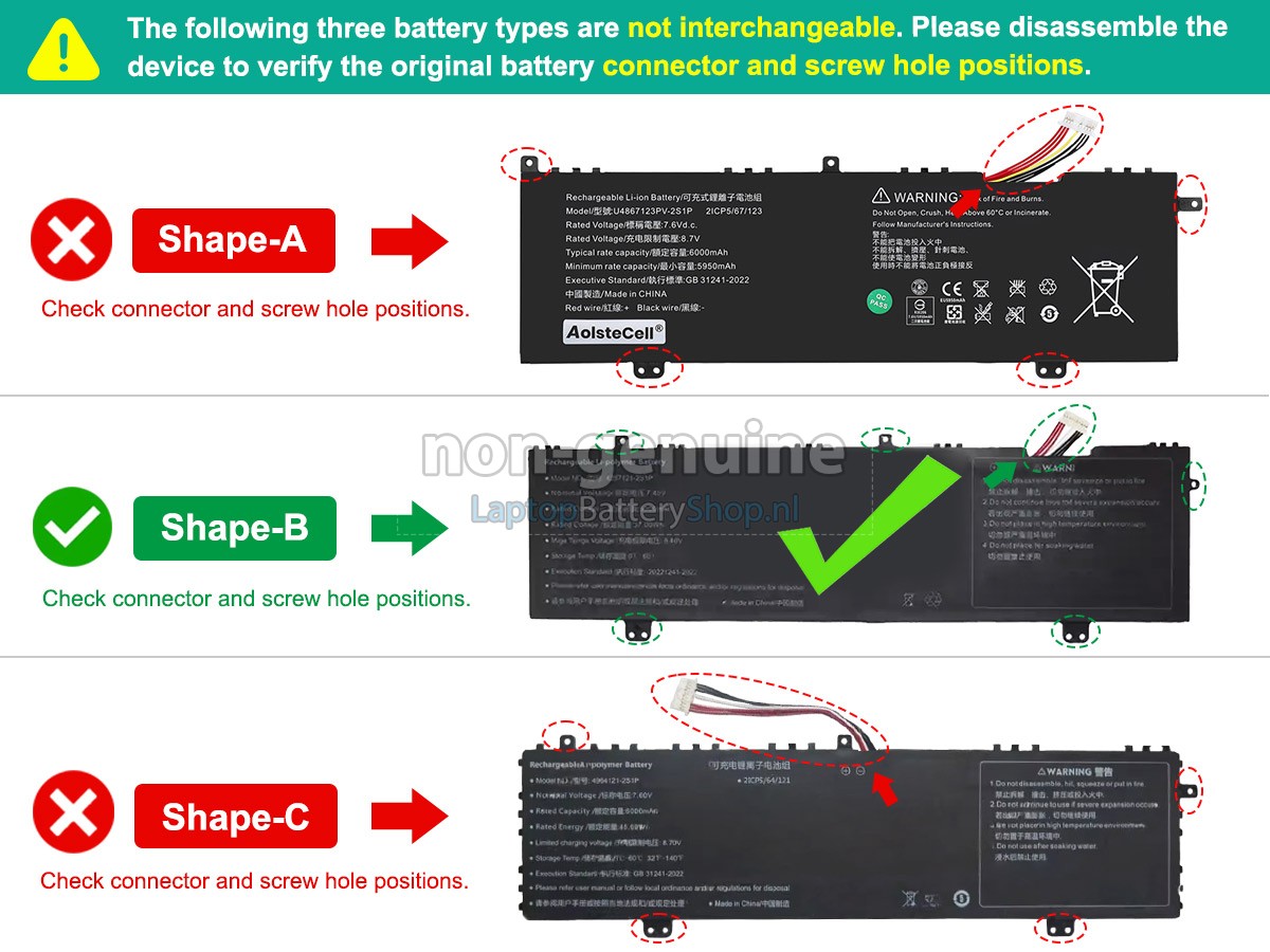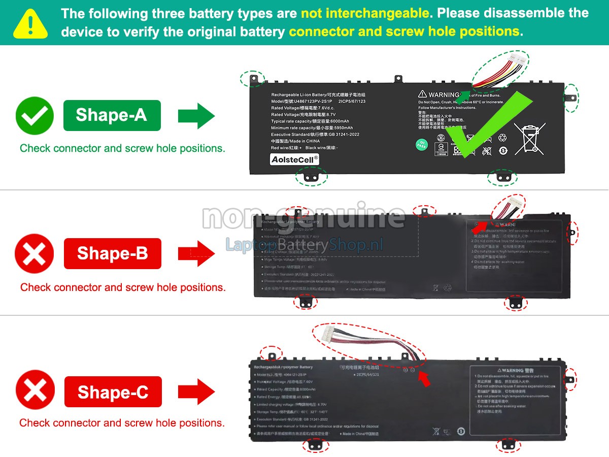 Controleer het model en de vorm van uw originele batterij van de Acer 4964121-2S1P (gebruik Ctrl + F om naar modellen te zoeken). Zorg ervoor dat u de juiste batterij krijgt.