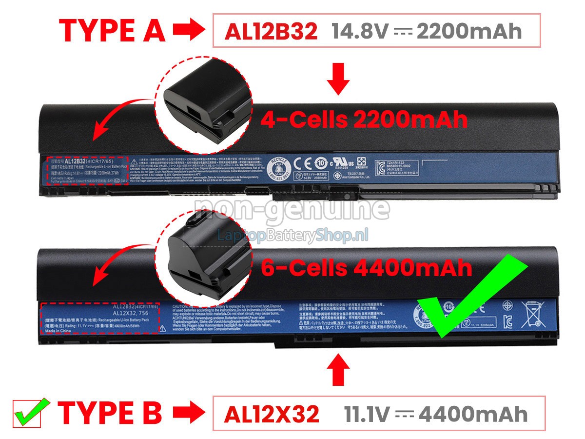 Controleer het model en de vorm van uw originele batterij van de Acer Aspire One 725-0802 (gebruik Ctrl + F om naar modellen te zoeken). Zorg ervoor dat u de juiste batterij krijgt.