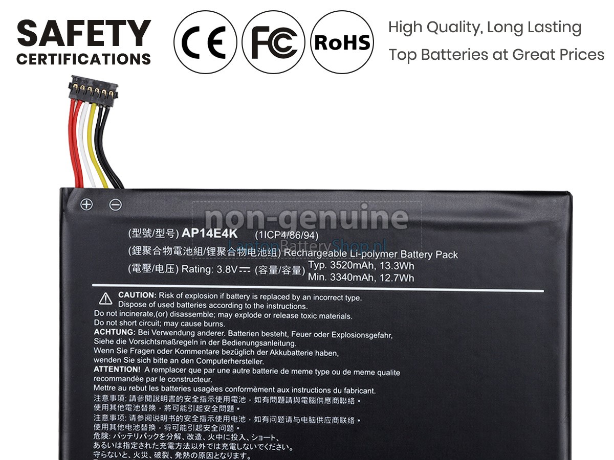 Wij hebben strenge eisen aan de prestaties en veiligheid van producten. De Acer Iconia One 7 B1-750-17CE laptop accu moet een aantal strenge kwaliteitscontroles en veiligheidstests ondergaan. Bovendien wordt de Acer Iconia One 7 B1-750-17CE-vervangende batterij rechtstreeks op laptopbatteryshop.nl verkocht en kost daarom ongeveer 20-50% minder dan andere tussenpersonen en fysieke winkels.