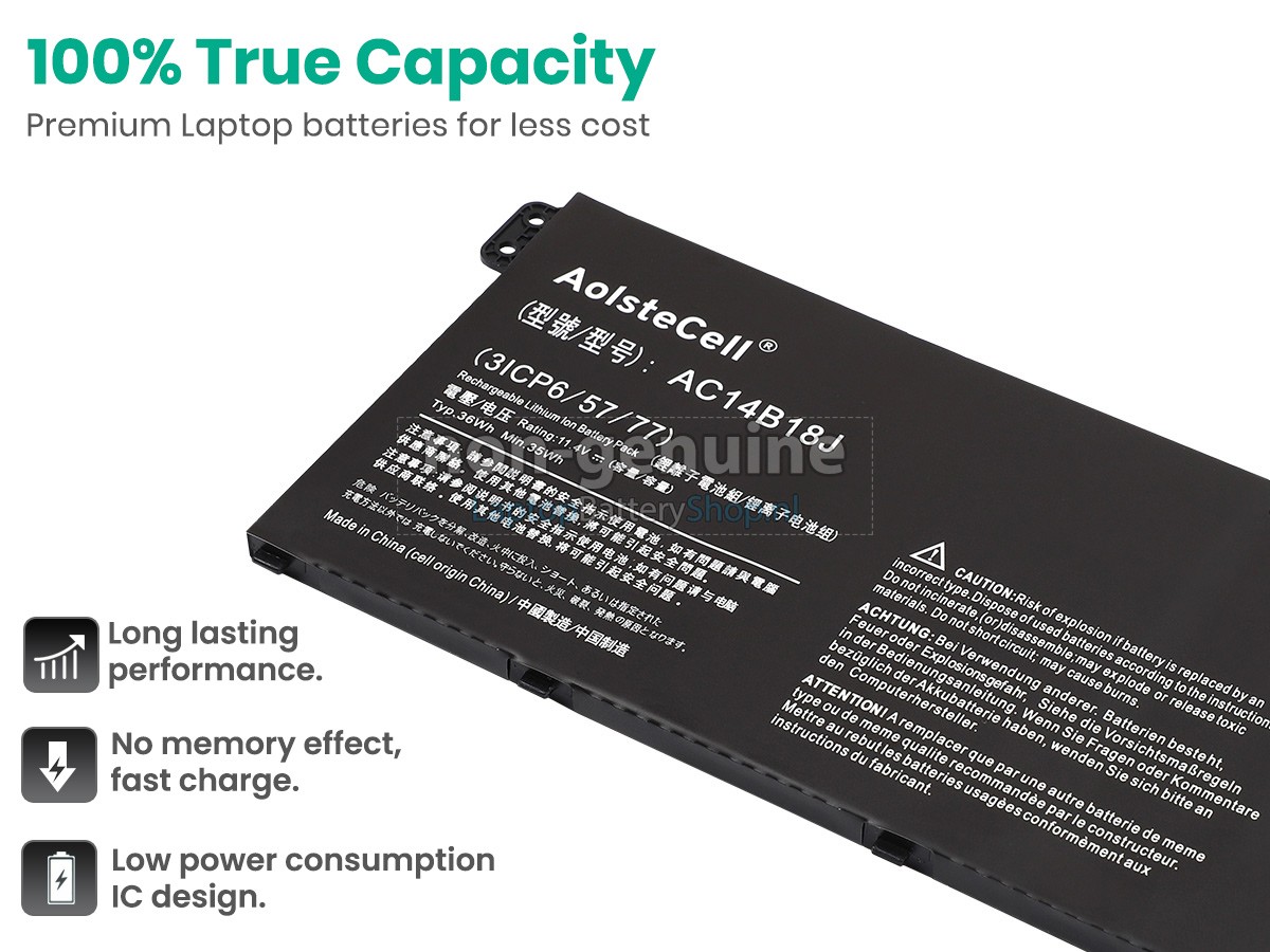 De Acer NX.MZ8EG.032 accu met lange levensduur bevat A-batterijen voor een langere levensduur van de batterij en meer oplaadcycli. Snelle levering, gemakkelijke terugkeer, 100% restitutie binnen 30 dagen. Before placing an order, please ensure your old battery is 11.4V 36Wh(3 cell), not a 15.2V, 4 cell battery.