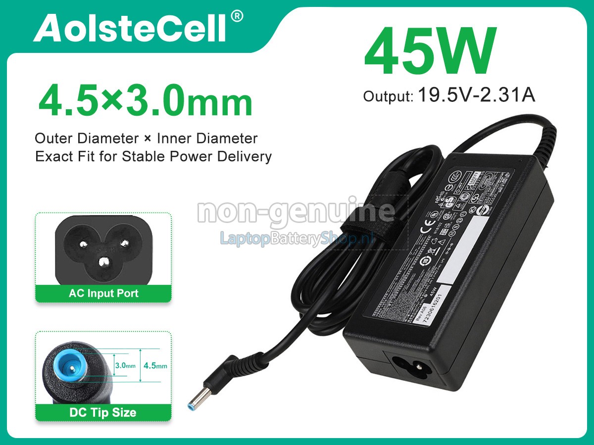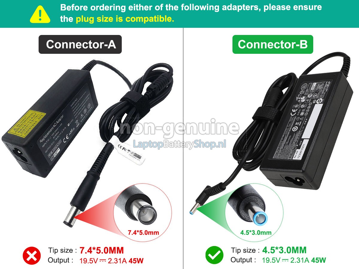 Controleer het model en de vorm van uw originele adapter van de HP 45W 19.5V-2.31A 100-240V~1.5A 50/60HZ (gebruik Ctrl + F om naar modellen te zoeken). Zorg ervoor dat u de juiste adapter krijgt.
