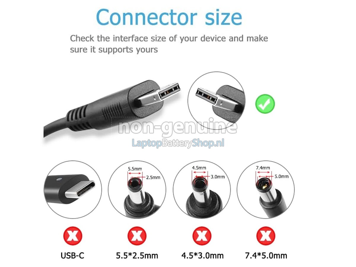 Zorg dat het voltage en de stroomsterkte overeenkomen: Kies een adapter die dezelfde of compatibele uitgangsspanning en -stroom (of vermogen) heeft op basis van de specificaties van de originele adapter. Het voltage moet exact overeenkomen of mag niet meer dan 1V verschillen, terwijl de stroom (of vermogen) iets hoger mag zijn maar niet lager voor efficiënt en veilig opladen.