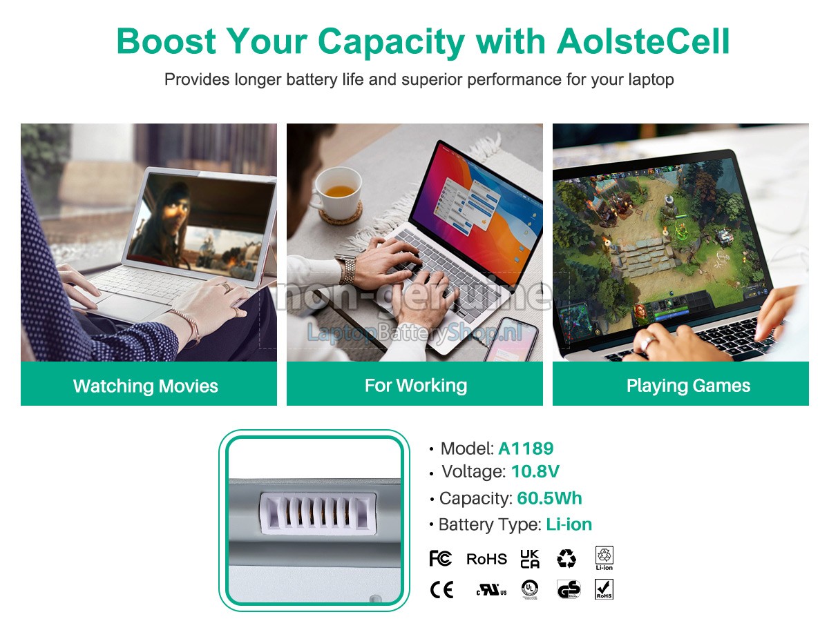 Wij hebben strenge eisen aan de prestaties en veiligheid van producten. De Apple MA897LL/A laptop accu moet een aantal strenge kwaliteitscontroles en veiligheidstests ondergaan. Bovendien wordt de Apple MA897LL/A-vervangende batterij rechtstreeks op laptopbatteryshop.nl verkocht en kost daarom ongeveer 20-50% minder dan andere tussenpersonen en fysieke winkels.