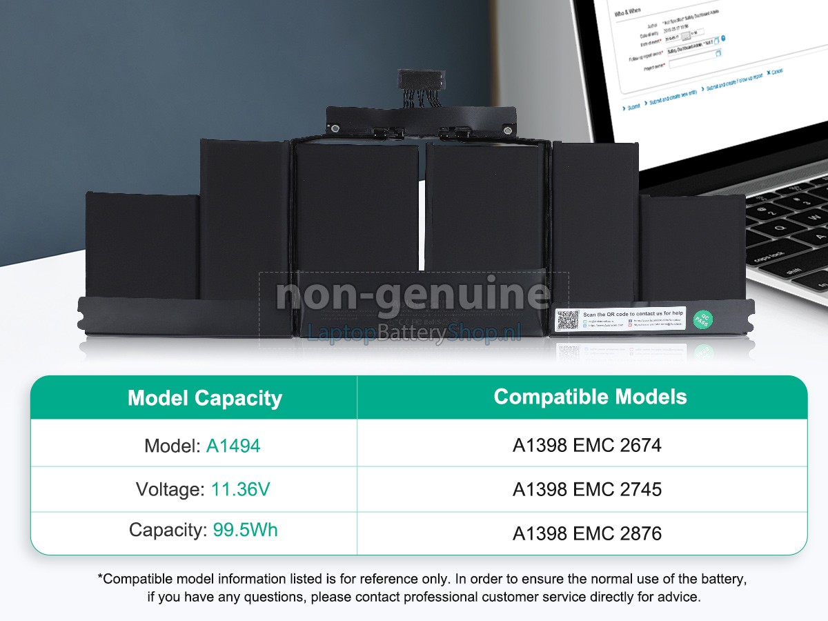 2. This battery(A1494) only compatibility with Apple Macbook Pro 15.4 Inch Retina A1398(EMC 2674),A1398(EMC 2745)(Late 2013) and A1398(EMC 2876),A1398(EMC 2881)(Mid 2014).3. Package Includes: 1 x Battery ,2 x Screwdrivers.
