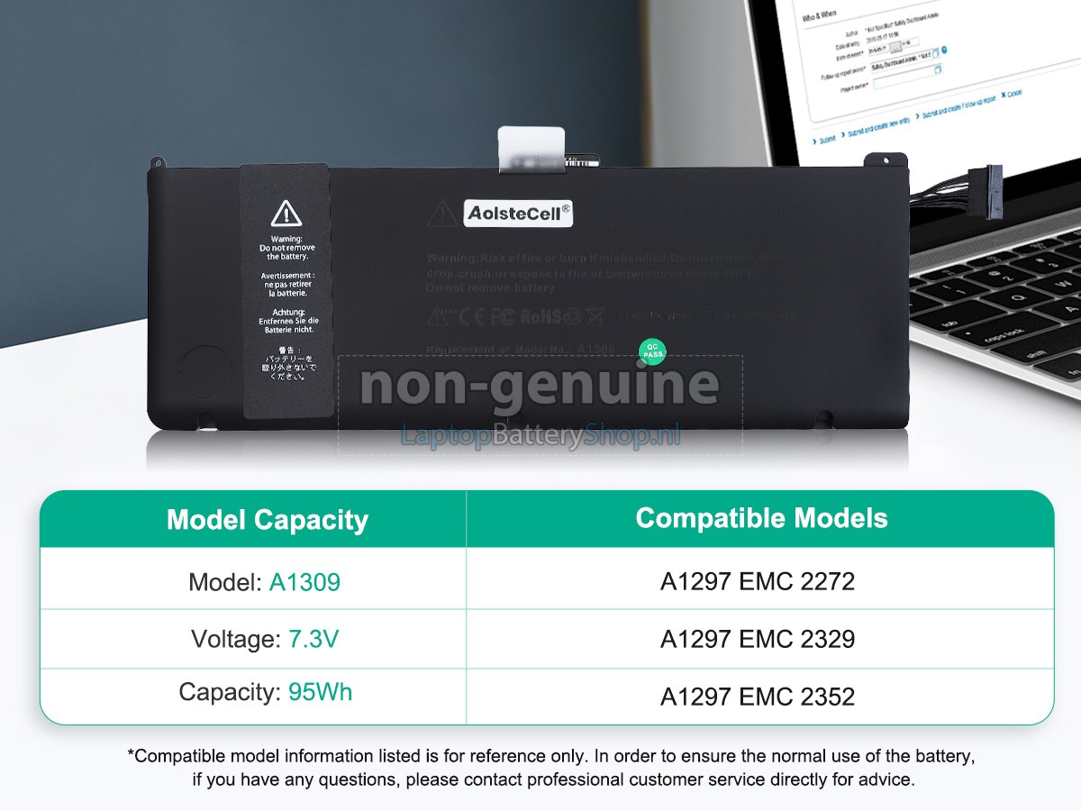 Note :1. 7.2V, 7.3V and 7.4V are compatible, they are in common use. 2. This battery(A1309) only fits for Apple MacBook Pro 17 inch A1297(Early 2009,Mid-2009 and Mid-2010), not fits for A1297(Early 2011 and Late 2011).3. Package Includes: 1 x Battery ,2 x Screwdrivers.