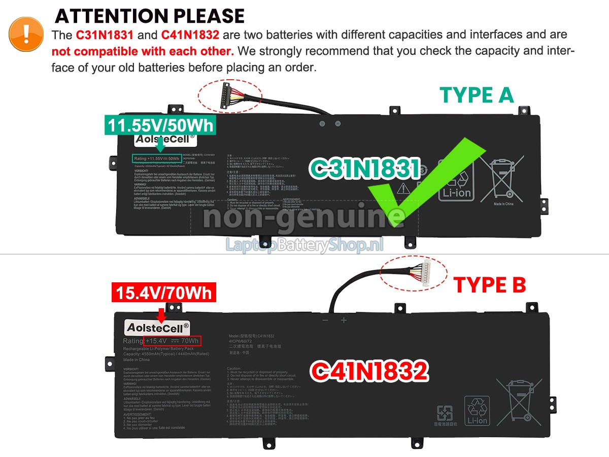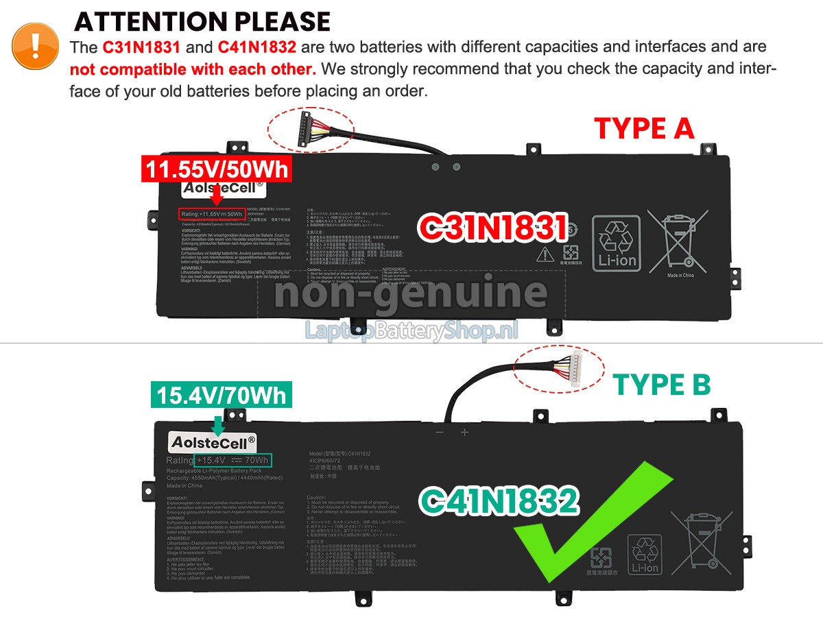 Controleer het model en de vorm van uw originele batterij van de Asus 0B200-03630300 (gebruik Ctrl + F om naar modellen te zoeken). Zorg ervoor dat u de juiste batterij krijgt.