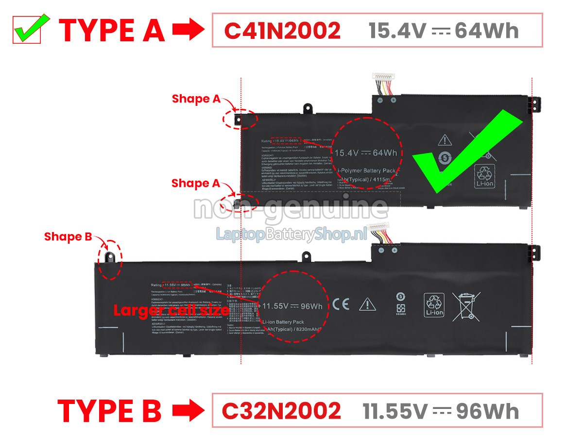 Controleer het model en de vorm van uw originele batterij van de Asus C41N2002 (gebruik Ctrl + F om naar modellen te zoeken). Zorg ervoor dat u de juiste batterij krijgt.