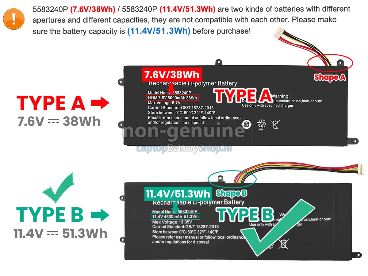 Controleer het model en de vorm van uw originele batterij van de Cooyes 5583240P (gebruik Ctrl + F om naar modellen te zoeken). Zorg ervoor dat u de juiste batterij krijgt.