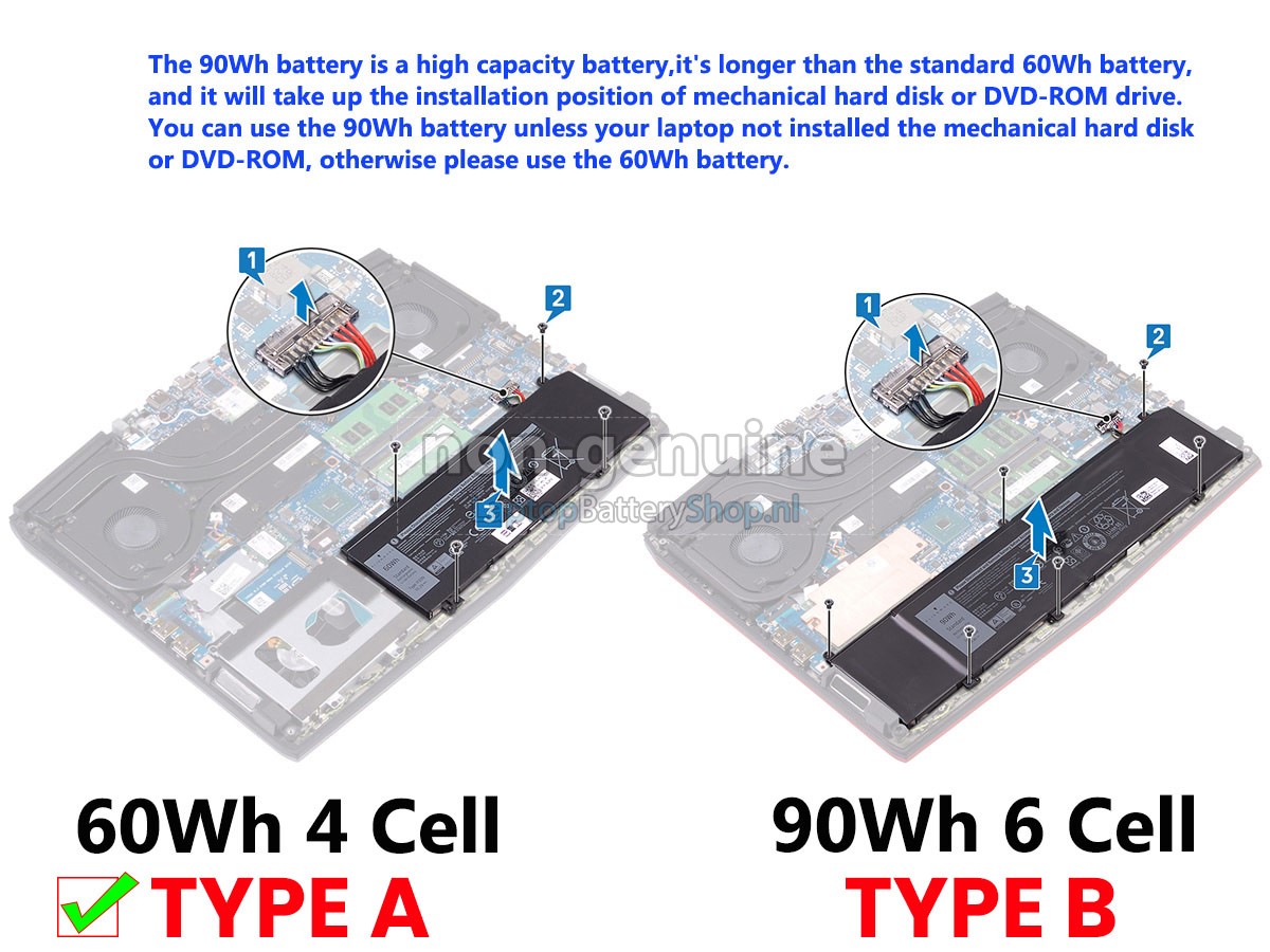 De Dell G7 7790-R1762B accu met lange levensduur bevat A-batterijen voor een langere levensduur van de batterij en meer oplaadcycli. Snelle levering, gemakkelijke terugkeer, 100% restitutie binnen 30 dagen. This is a high capacity(90Wh) battery,it's longer than the standard 60Wh battery, and it will take up the installation position of mechanical hard disk or DVD-ROM drive. You can use the 90Wh battery unless your laptop not installed the mechanical hard disk or DVD-ROM, otherwise please use the 60Wh battery.