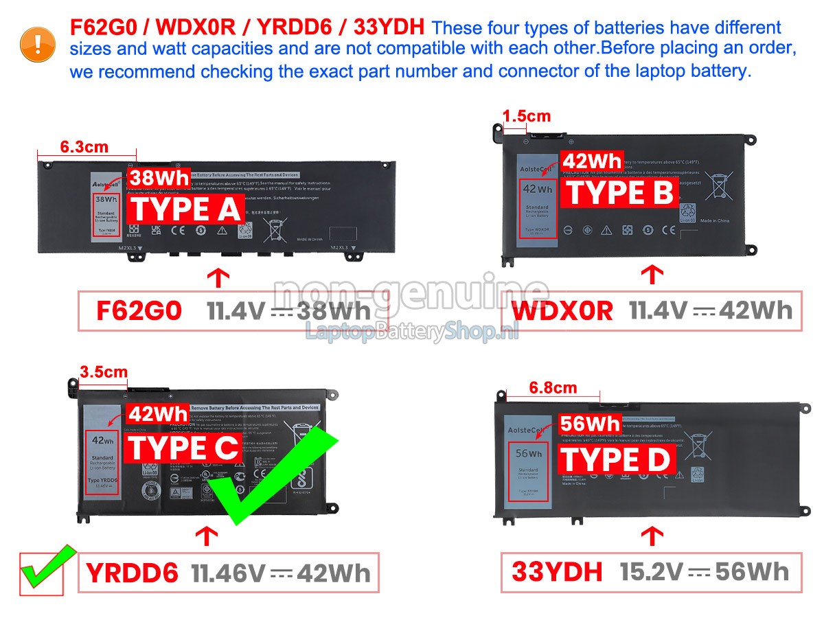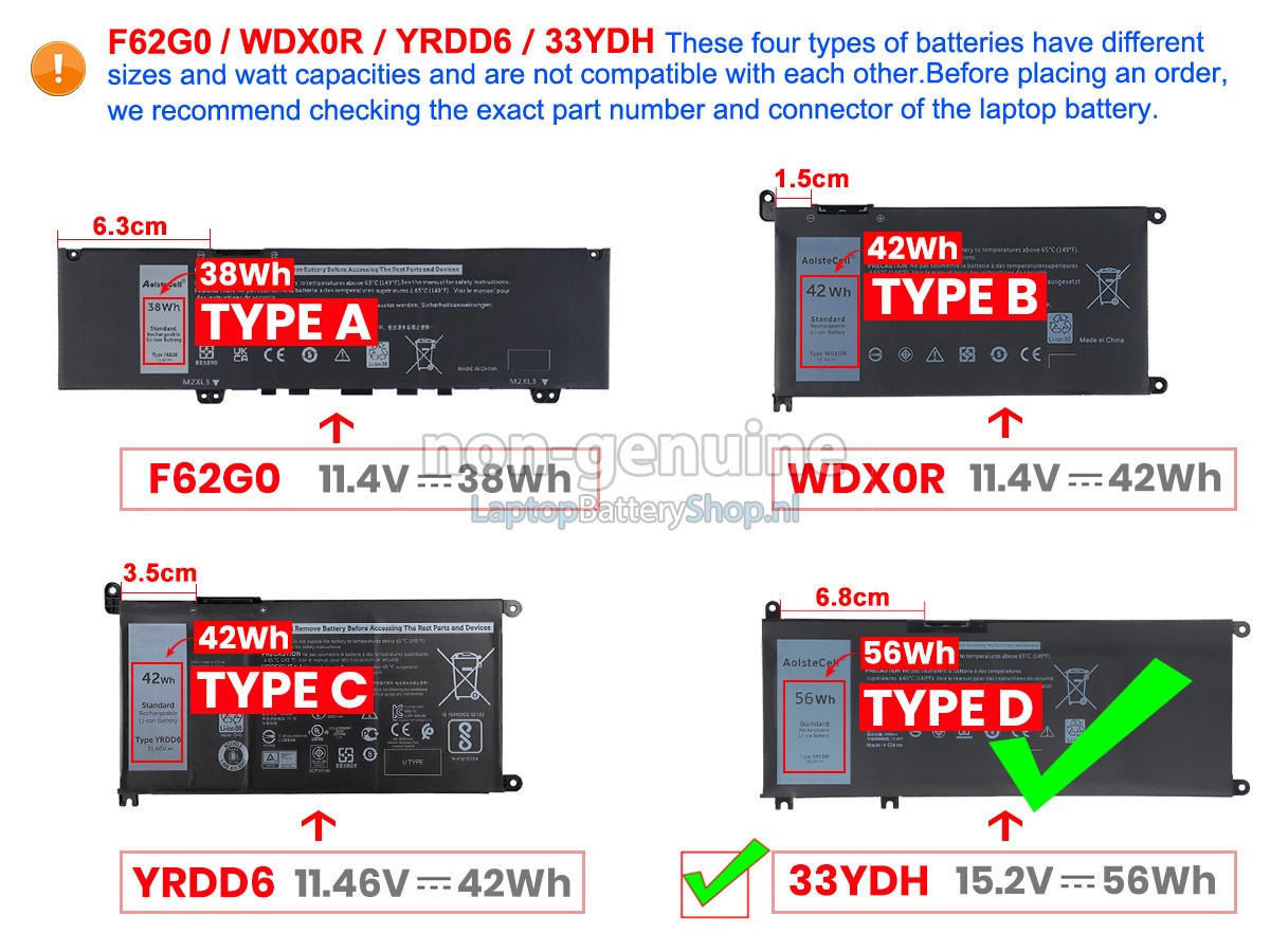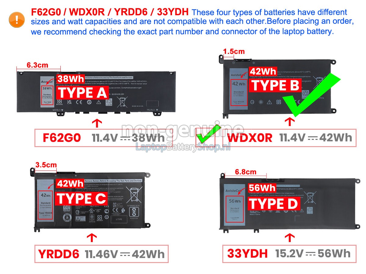 Controleer het model en de vorm van uw originele batterij van de Dell Inspiron 13 7000 2-IN-1 (gebruik Ctrl + F om naar modellen te zoeken). Zorg ervoor dat u de juiste batterij krijgt.