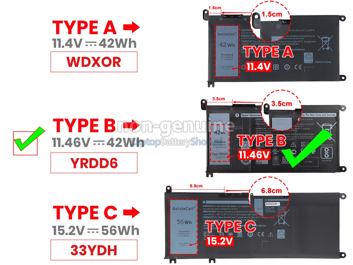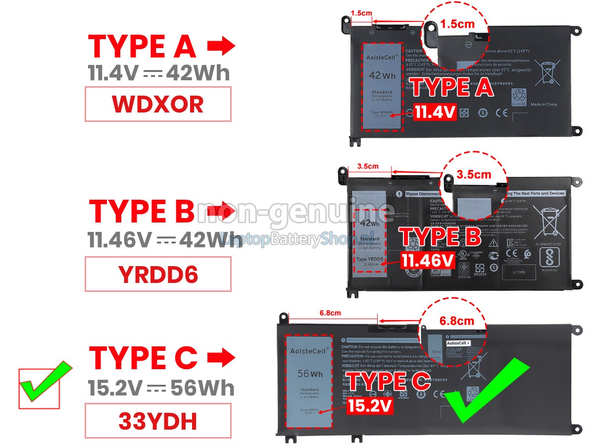 Controleer het model en de vorm van uw originele batterij van de Dell Inspiron 15 (7579) (gebruik Ctrl + F om naar modellen te zoeken). Zorg ervoor dat u de juiste batterij krijgt.