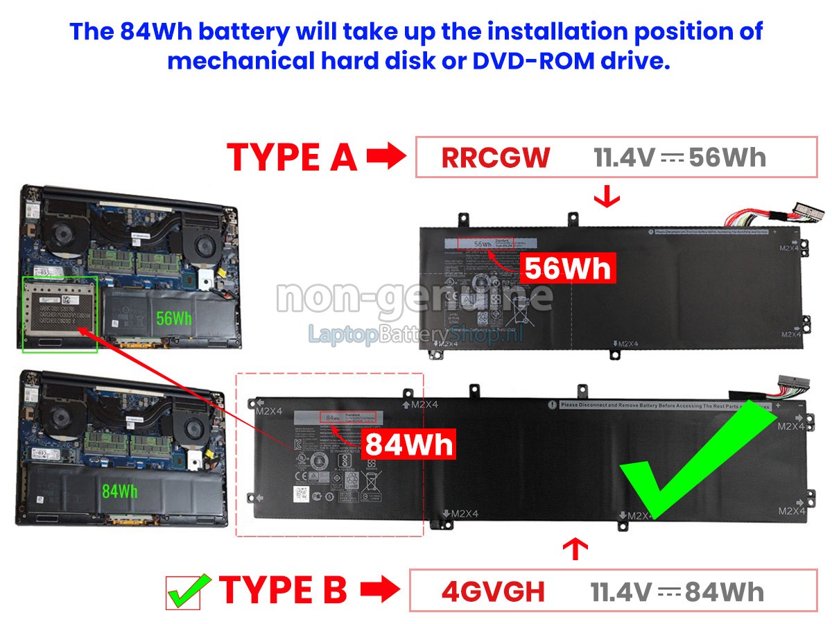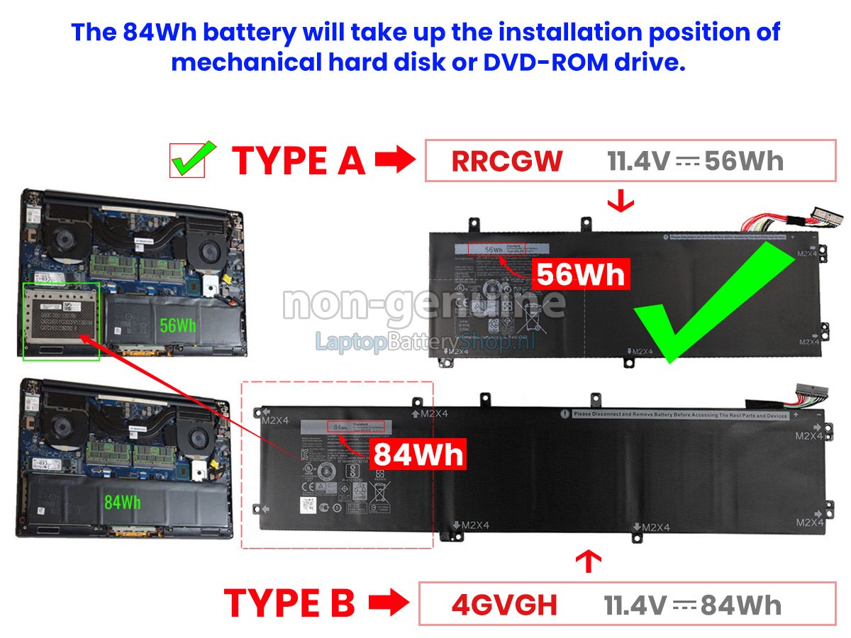 De Dell P56F accu met lange levensduur bevat A-batterijen voor een langere levensduur van de batterij en meer oplaadcycli. Snelle levering, gemakkelijke terugkeer, 100% restitutie binnen 30 dagen. This is a high capacity(84Wh) battery,it's longer than the standard 56Wh battery, and it will take up the installation position of mechanical hard disk or DVD-ROM drive. You can use the 84Wh battery unless your laptop not installed the mechanical hard disk or DVD-ROM, otherwise please use the 56Wh battery.