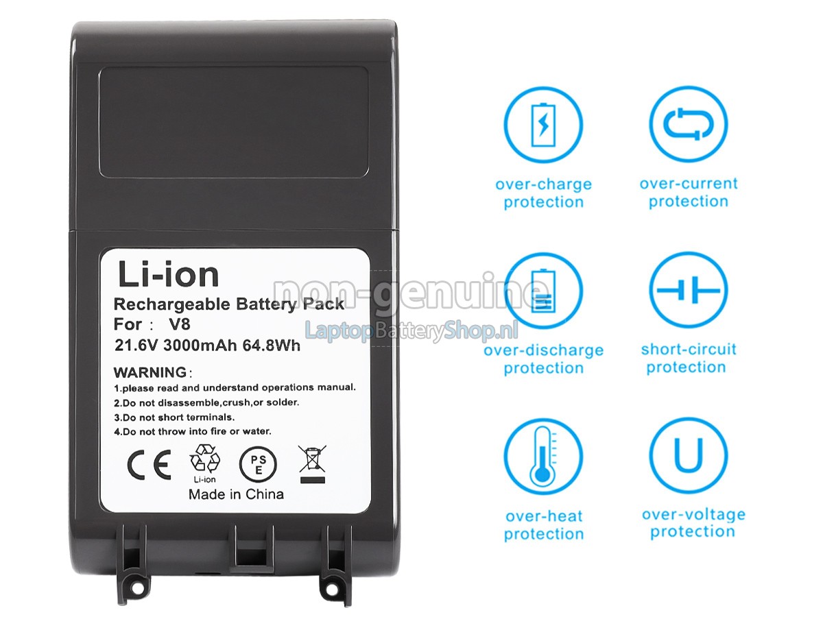 Wij hebben strenge eisen aan de prestaties en veiligheid van producten. De Dyson V8 ANIMAL EXCLUSIVE VACUUM accu moet een aantal strenge kwaliteitscontroles en veiligheidstests ondergaan. Bovendien wordt de Dyson V8 ANIMAL EXCLUSIVE VACUUM-vervangende batterij rechtstreeks op laptopbatteryshop.nl verkocht en kost daarom ongeveer 20-50% minder dan andere tussenpersonen en fysieke winkels.