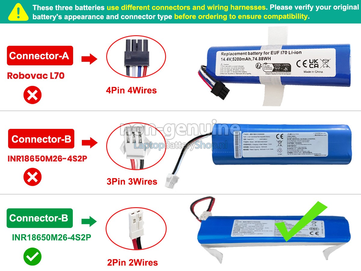 De Eufy INR18650M26-4S2P accu met lange levensduur bevat A-batterijen voor een langere levensduur van de batterij en meer oplaadcycli. Snelle levering, gemakkelijke terugkeer, 100% restitutie binnen 30 dagen. The two batteries have different wiring and are incompatible. Before placing an order, make sure your existing battery exactly matches our replacement battery.
