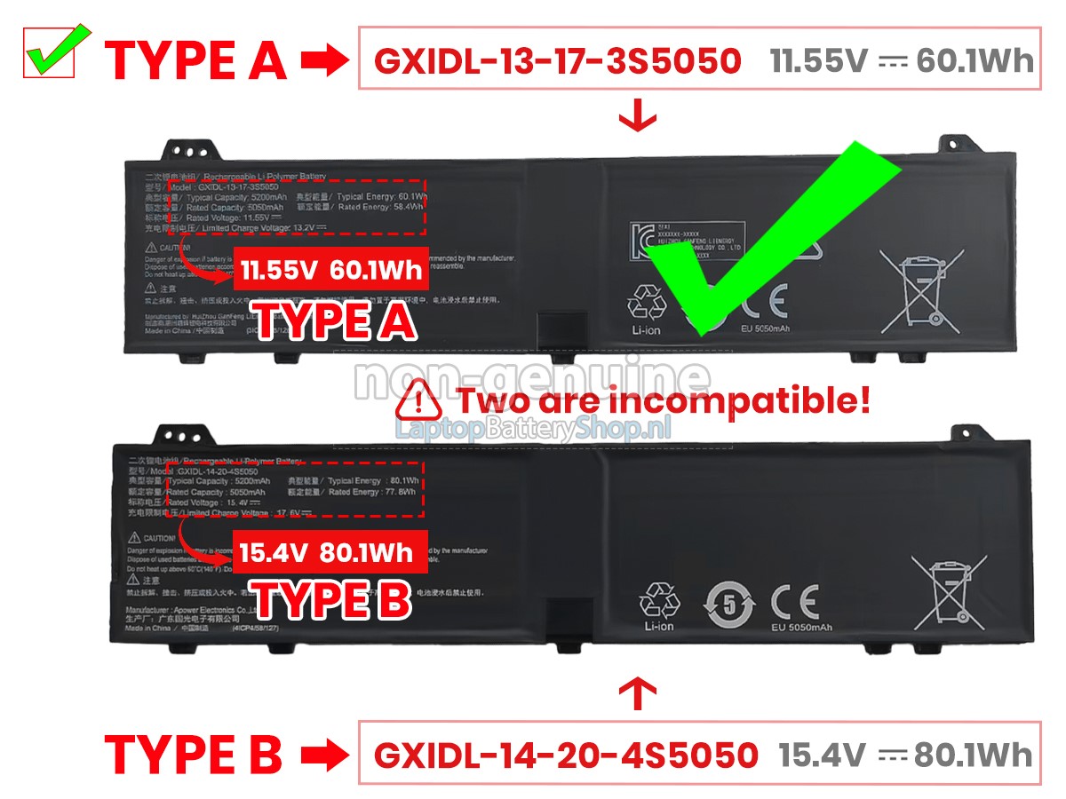 Controleer het model en de vorm van uw originele batterij van de Mechrevo GXIDL-13-17-3S5050 (gebruik Ctrl + F om naar modellen te zoeken). Zorg ervoor dat u de juiste batterij krijgt.