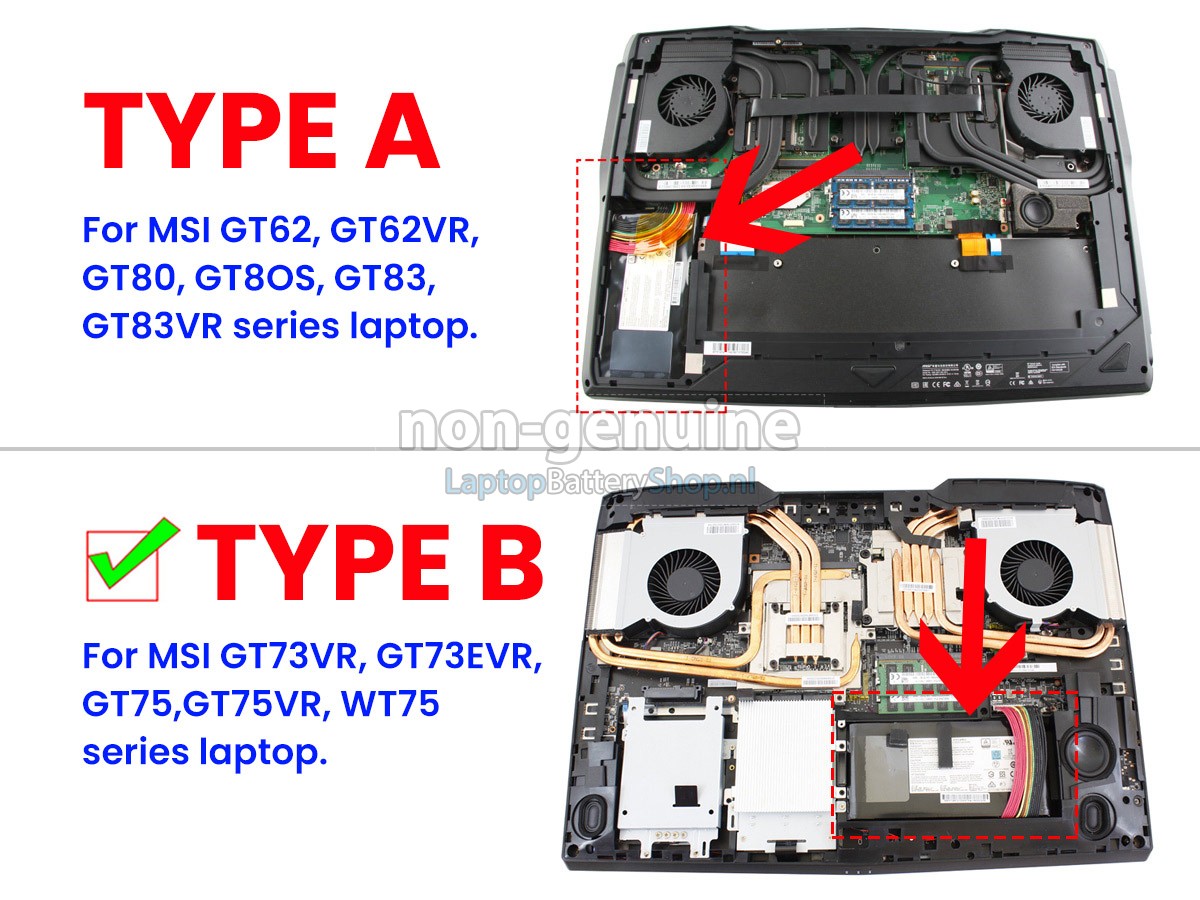 Controleer het model en de vorm van uw originele batterij van de MSI GT80 (gebruik Ctrl + F om naar modellen te zoeken). Zorg ervoor dat u de juiste batterij krijgt.