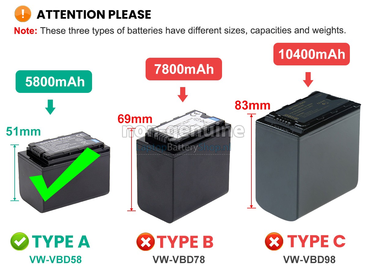 De Panasonic HC-MDH2 accu met lange levensduur bevat A-batterijen voor een langere levensduur van de batterij en meer oplaadcycli. Snelle levering, gemakkelijke terugkeer, 100% restitutie binnen 30 dagen. VW-VBD58/78/98 has capacity and size differences, can be compatible with the use of larger capacity battery will have a part of the battery bulge.