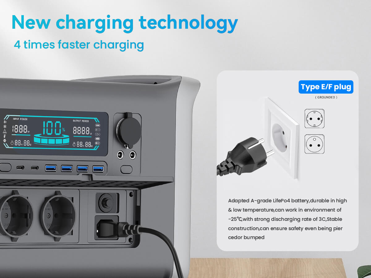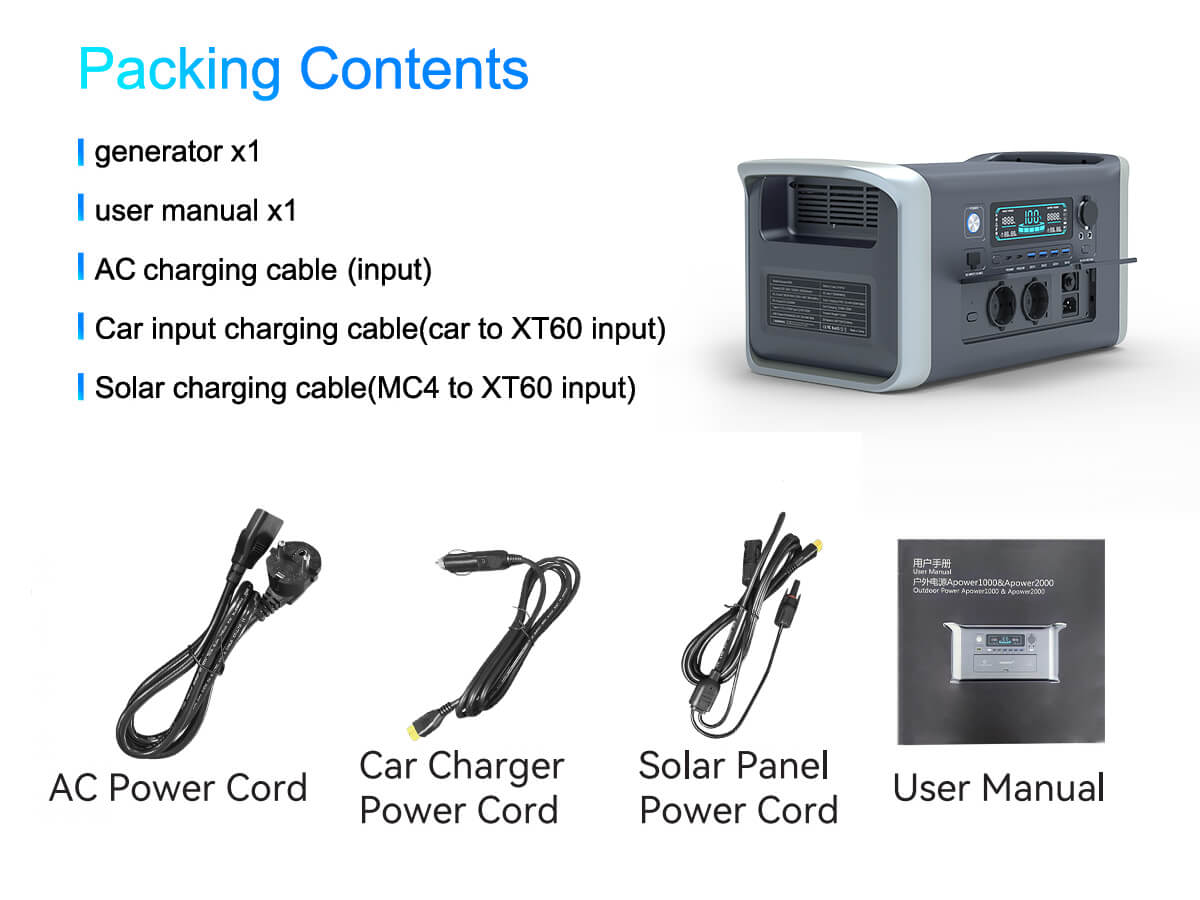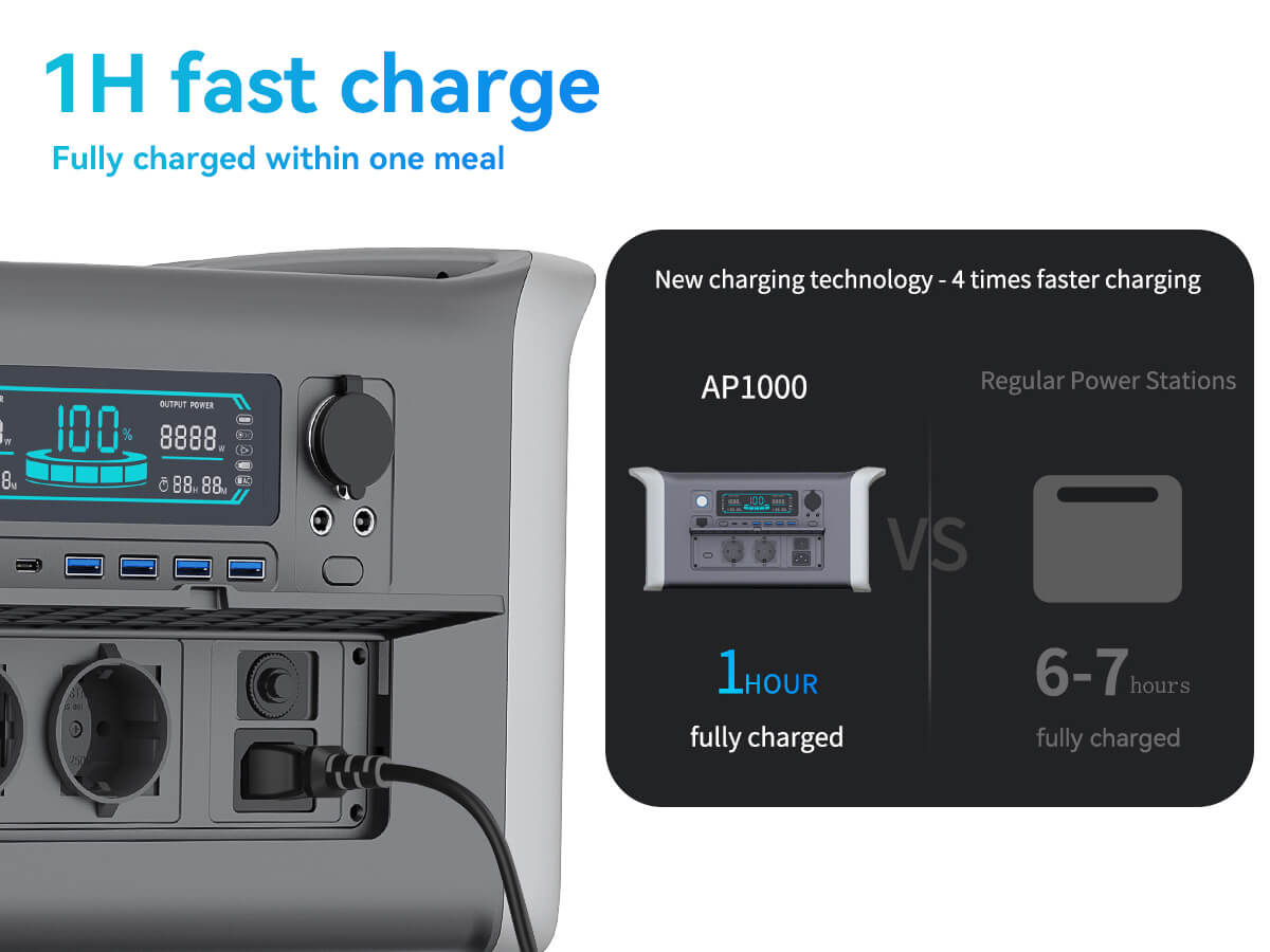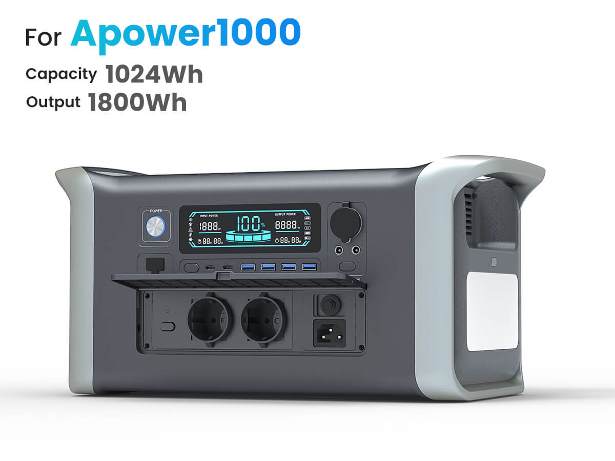 Onze Apower1000 draagbare power station is uitgerust met een enorme 1024Wh LiFePO4-batterij. Deze krachtige batterij, bekend om zijn lange levensduur en veiligheid, zorgt ervoor dat u altijd een betrouwbare energiebron hebt voor al uw buitenavonturen. Of u nu gaat kamperen, een RV-reis maakt, of een noodstroomvoorziening nodig hebt, deze power station staat voor u klaar.