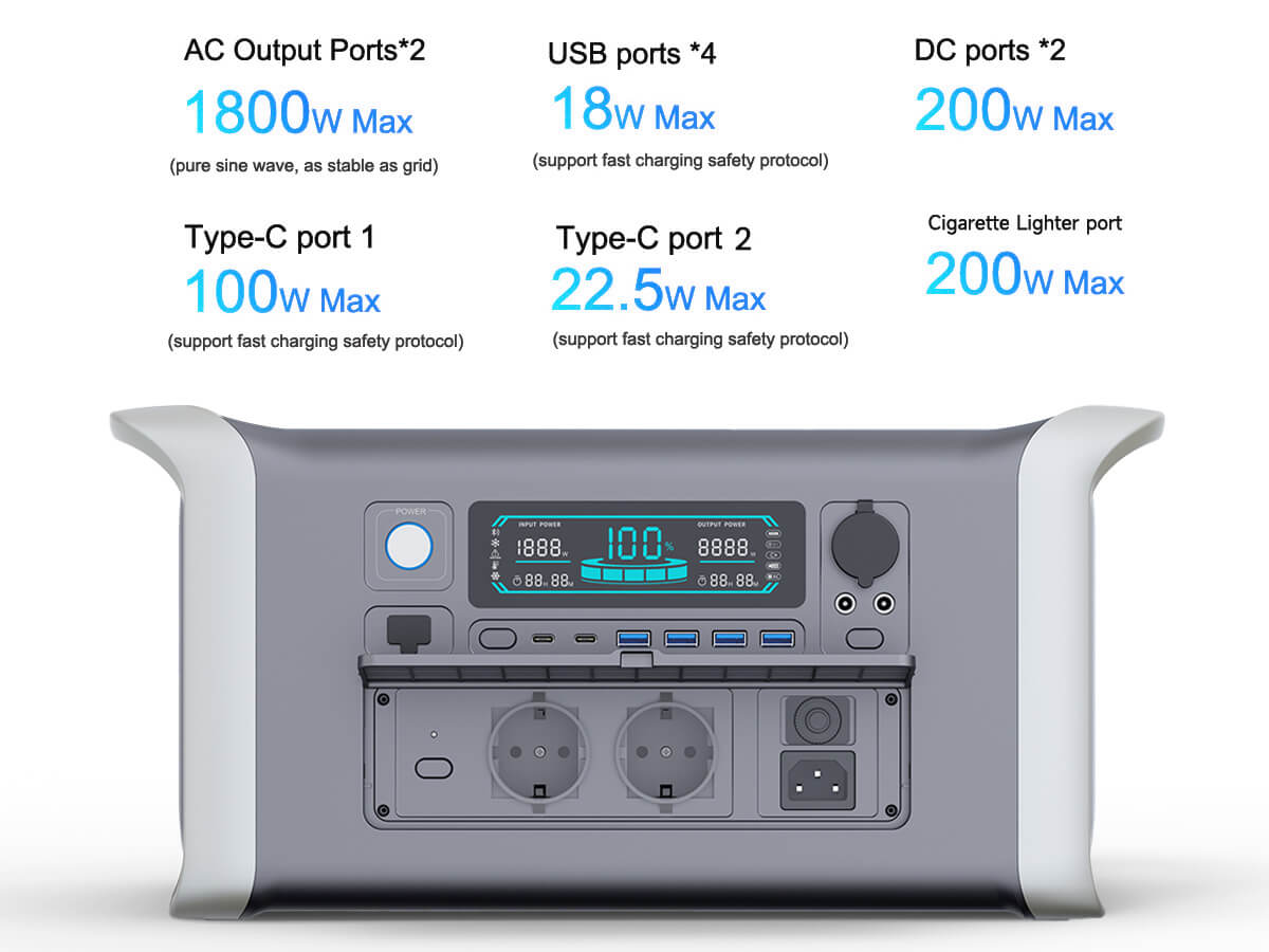 Onze Apower1000 draagbare power station biedt een indrukwekkende AC-uitgang van 1800W (220V) of 1600W (110V), waardoor u flexibel een breed scala aan apparaten en apparatuur kunt van stroom voorzien. Daarnaast biedt het een krachtige DC-uitgang van 12V18A/200W Max, wat het geschikt maakt voor verschillende toepassingen. Deze veelzijdigheid zorgt ervoor dat al uw energiebehoeften efficiënt en betrouwbaar worden vervuld.
