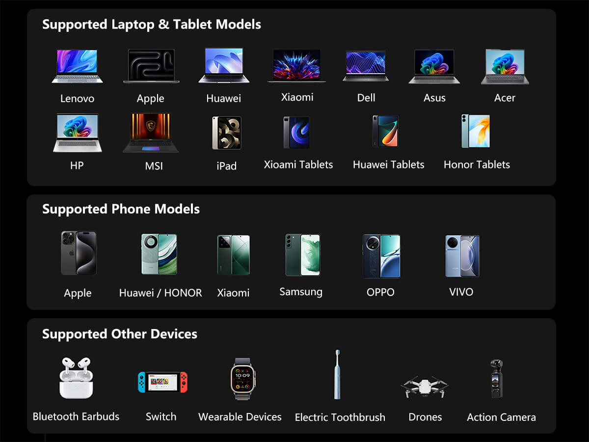 Met één Type-C-poort (in- en uitgang tot 100W) en twee USB-A-poorten tot 22,5W kun je meerdere apparaten tegelijk opladen. Ook geschikt voor draadloze oordopjes, wearables, drones, action cameras en handheld gameconsoles.