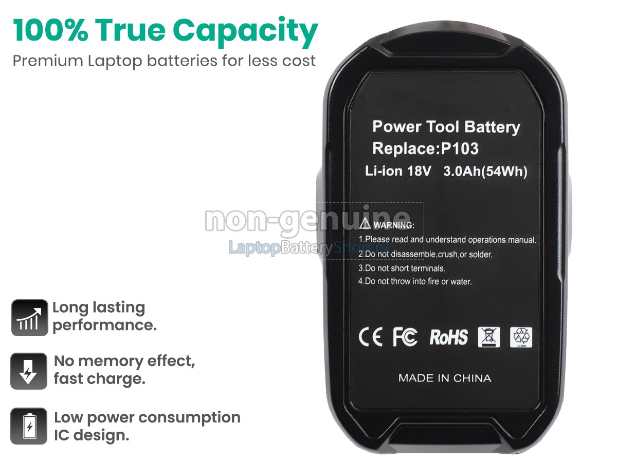 Wij hebben strenge eisen aan de prestaties en veiligheid van producten. De Ryobi P100 accu moet een aantal strenge kwaliteitscontroles en veiligheidstests ondergaan. Bovendien wordt de Ryobi P100-vervangende batterij rechtstreeks op laptopbatteryshop.nl verkocht en kost daarom ongeveer 20-50% minder dan andere tussenpersonen en fysieke winkels.